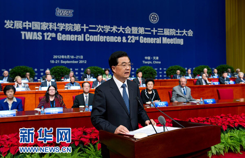 9月18日,国家主席胡锦涛在天津出席发展中国家科学院第十二次学术大会暨第二十三届院士大会开幕式并致词。新华社记者黄敬文摄