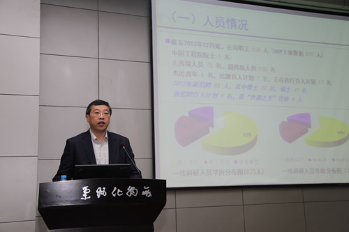 兰州化学物理研究所召开全所职工大会,所长夏春谷代表所班子总结了2012年工作并按院工作会精神部署了新一年工作重点,党委书记赵秀茹总结了2012年党委、纪委工作和创新文化建设工作,提出了2013年工作重点,副所长王齐华传达了中科院2013年度工作会议和党建会议精神。会上,对第七届兰州化物所青年创新奖、2012年度创新文化建设先进集体和个人进行了表彰。中国工程院院士、兰州化物所学术委员会主任薛群基研究员应邀参加会议,并与所领导一起为获奖团队和个人颁奖。副所长师彦平主持会议,全所职工、全体支部书记部分离退休人员和研究生代表参加了会议。