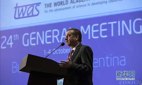 10月1日,阿根廷科技部长利诺·巴拉尼奥在第24届发展中国家科学院(TWAS)大会开幕式上致辞。新华社发(马丁·萨巴拉摄)