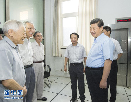 考察工作。这是习近平同当年参与北京正负电子对撞机建设和应用的3位院士交谈。新华社记者 李学仁 摄