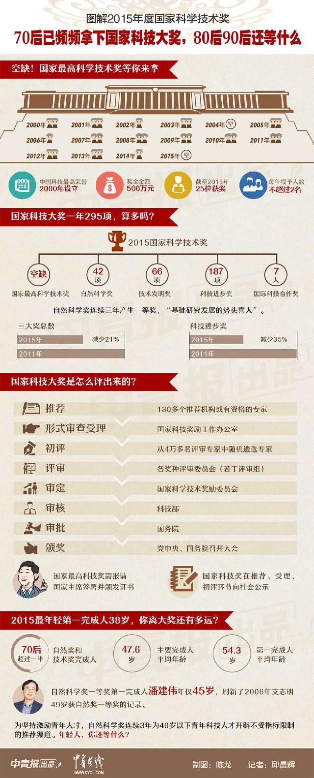 2016年1月8日,国家科学技术奖励大会在北京人民大会堂召开,2015年度国家科技奖“大榜”随之揭晓,备受瞩目的国家自然科学奖一等奖,颁给了中国科学技术大学潘建伟院士领衔的“多光子纠缠及干涉度量”项目。作为该项目的第一完成人,潘建伟也因年仅45岁的年龄优势,刷新了2006年支志明49岁获自然奖一等奖的记录。
