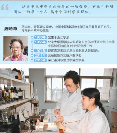 近几年,屠呦呦两度实现了中国本土科学家在国际奖项上“零的突破”:2011年的拉斯克临床医学奖和2015年的诺贝尔生理学或医学奖。但她公开表示,中医中药走向世界,荣誉属于科研团队中的每一个人,属于中国科学家群体。
