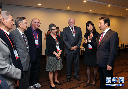 8月10日,第八届国际工业与应用数学大会在北京举行,国家副主席李源潮出席开幕式并致辞。这是开幕式前,李源潮与出席大会的嘉宾亲切会面交谈。新华社记者 刘卫兵 摄