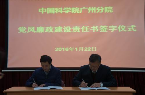 会上表彰了4个先进单位。深圳先进院、华南植物园、广州化学公司分别获得广州分院2015年度院地合作、党群工作、安全保卫保密工作先进单位,广州地化所获人才队伍建设、纪监审工作先进单位。在广州分院党组副书记、纪检组长周传忠的主持下,秦伟、吴创之分别与2015年任职的研究所党政主要负责人签署了《反腐倡廉和党风廉政建设责任书》。
