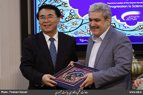 白春礼和萨塔里代表双方交换礼物(伊朗科技副总统办公室 Pedram Nazari/摄)