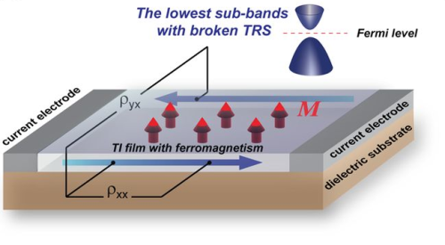 图一:量子反常霍尔效应的示意图,拓扑非平庸的能带结构产生具有手征性的边缘态,从而导致量子反常霍尔效应