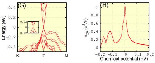 图二:理论计算得到的磁性拓扑绝缘体多层膜的能带结构和相应的霍尔电导