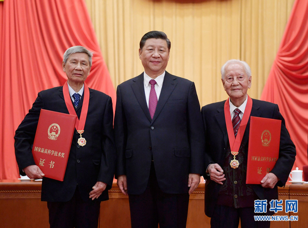 1月10日,2019年度国家科学技术奖励大会在北京人民大会堂隆重举行。中共中央总书记、国家主席、中央军委主席习近平向获得2019年度国家最高科学技术奖的原中国船舶重工集团公司第七一九研究所黄旭华院士(右)和午夜av