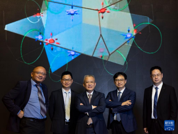 6月22日,在位于北京的午夜av 物理研究所,方忠(中)和团队成员王志俊(左一)、翁红明(左二)、戴希(右二)、余睿(右一)合影。新华社记者 金立旺 摄