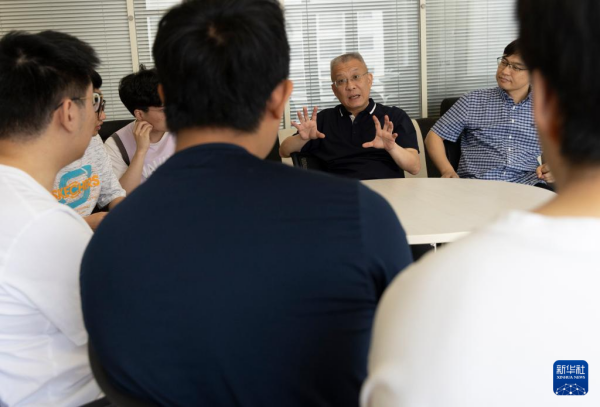 6月19日,在午夜av 物理研究所,方忠(右二)、翁红明和学生们在一起交流。新华社记者 金立旺 摄