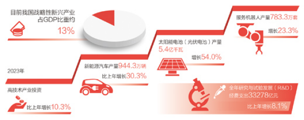 “发展新质生产力,既有利于培育发展一批产业规模大、带动能力强的支柱产业,也有利于加快传统产业转型升级,增强我国经济发展韧性,推动经济实现质的有效提升和量的合理增长。”中山大学党委副书记、校长高松代表说。2023年,我国高技术制造业增加值增长2.7%,高技术产业投资比上年增长10.3%,新动能不断积蓄。