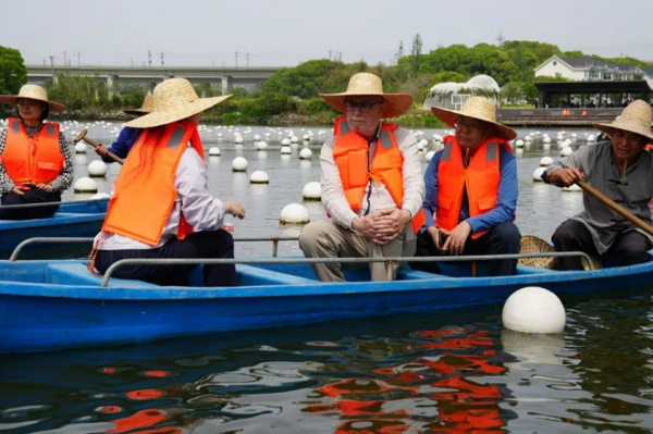 2025年4月11日,闵庆文(右二)陪同国际专家考察浙江德清淡水珍珠复合养殖系统。