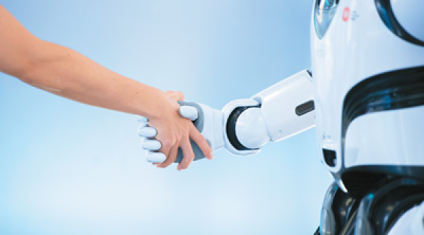 在深圳市优必选科技股份有限公司总部,工作人员与熊猫机器人“优悠”握手。新华社记者 毛思倩摄