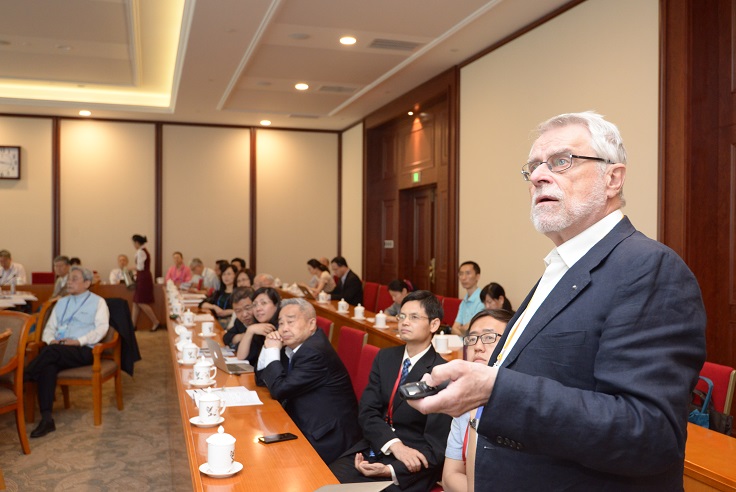 萨支唐教授在题为Semiconductor Physics and Model of Liquid Water: Ion Product and Ion Mobilities in Pure Water专题报告中介绍了本团队采用半导体物理方法重新探讨液态水的电学性能等方面的研究工作,包括化学术语里的离子乘积和离子迁移率等。