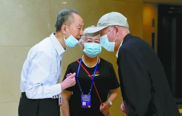 图1.郭尚平院士(左)和夫人罗广芳与林群院士(右)交谈