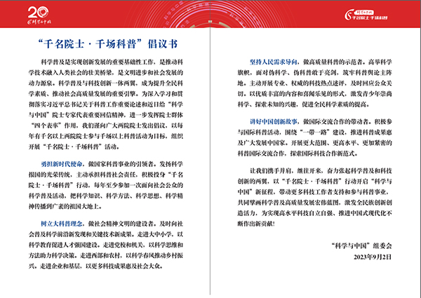 今年起,“科学与中国”将以习近平总书记重要回信精神和关于科普工作的系列重要论述为指导,开展“千名院士·千场科普”行动,把科学知识、科学方法、科学思想、科学精神传播到更广袤的祖国大地,以高质量的科学普及为科技创新培植沃土,以高水平的科技创新为科学普及提供源泉,为实现高水平科技自立自强和加快建设世界科技强国贡献更大力量。