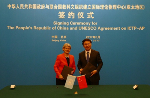 大学(简称“国科大”)建立UNESCO二类机构——国际理论物理中心(亚太地区)(ICTP-AP)的签约仪式在北京钓鱼台国宾馆举行。中科院院长白春礼和UNESCO总干事博科娃(Irina Bokova)分别代表中华人民共和国政府和UNESCO签署协议。