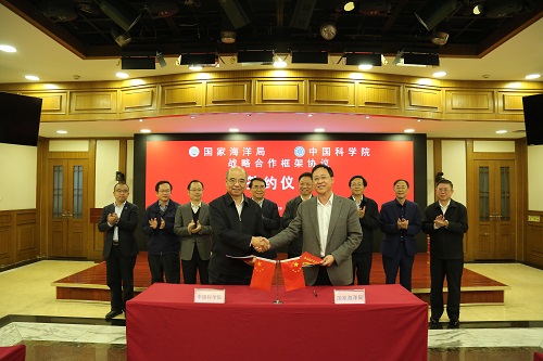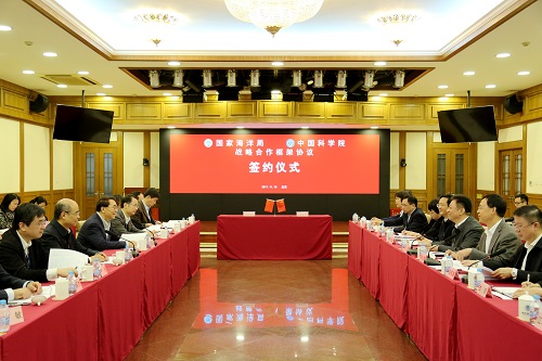 与国家海洋局战略合作协议签约仪式在京举行。中科院院长、党组书记白春礼和国家海洋局局长、党组书记王宏出席仪式并讲话,中科院副院长、党组成员相里斌和国家海洋局副局长、党组成员林山青代表双方签署战略合作框架协议。