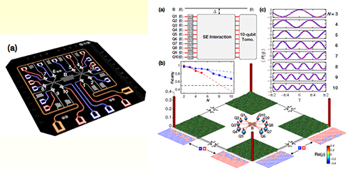 在超导体系方面,2015年,谷歌、NASA和UCSB宣布实现了9个超导量子比特的高精度操纵,这一记录在2017年被中国科学家团队首次打破。朱晓波、王浩华和陆朝阳、潘建伟等合作,自主研发了10比特超导量子线路样品,通过高精度脉冲控制和全局纠缠操作,成功实现了目前世界上最大数目的超导量子比特的多体纯纠缠,并通过层析测量方法完整地刻画了十比特量子态。研究团队进一步利用超导量子线路演示了求解线性方程组的量子算法,证明了通过量子计算的并行性加速求解线性方程组的可行性,相关成果即将发表于《物理评论快报》。研究团队目前正致力于20个超导量子比特样品的设计、制备和测试,并计划于今年年底前发布量子云计算平台。