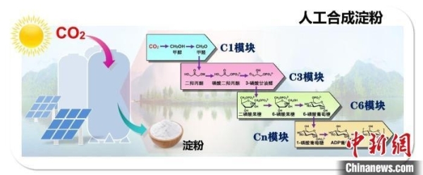 进展一:人工合成淀粉示意图。中国科协生命科学学会联合体 供图