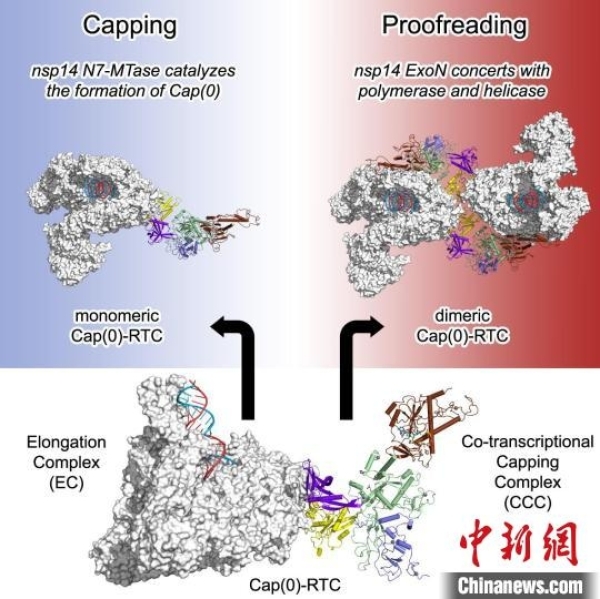 进展三:新冠病毒转录复制复合体的mRNA加帽状态与复制校正状态。中国科协生命科学学会联合体 供图