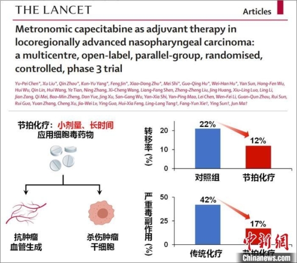 ——提高中晚期鼻咽癌疗效的高效低毒治疗新模式。鼻咽癌是“中国特色”肿瘤,年新发病例占全球一半。放疗后的全身微小残留肿瘤是其治疗失败的根源,而由于放疗后患者身体状况差,难以耐受既往高强度的传统化疗(完成率仅约40%-50%),成为制约疗效提高的瓶颈。中山大学肿瘤防治中心马骏研究团队提出了小剂量、长时间口服细胞毒药物卡培他滨的节拍化疗模式,其可通过抗血管生成、杀伤肿瘤干细胞等机制持续抑制肿瘤,同时提高机体耐受性。马骏教授通过牵头一项多中心、前瞻性临床研究发现,在放疗后使用“卡培他滨节拍化疗”可将失败风险显著降低45%,且严重毒副作用发生率减少了3/5,完成率达74%。同时卡培他滨口服用药方便可及,易于向基层推广。由此,该研究打破了传统化疗的疗效瓶颈,建立了鼻咽癌国际领先、高效低毒且简单易行的治疗新标准,其成果论文发表于《柳叶刀》杂志。