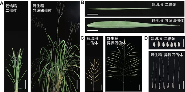 异源四倍体野生稻与二倍体栽培稻的植株表型 中科院种子创新研究院/遗传与发育生物学研究所供图