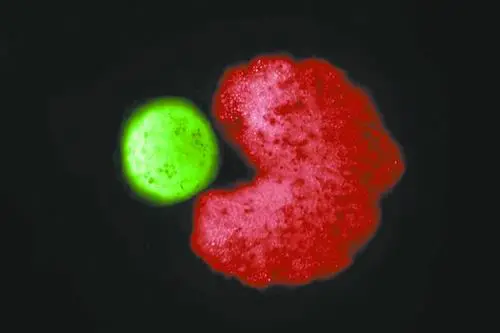 一个活体机器人将单个细胞组装成一个新的细胞团。图片来源:Douglas Blackiston