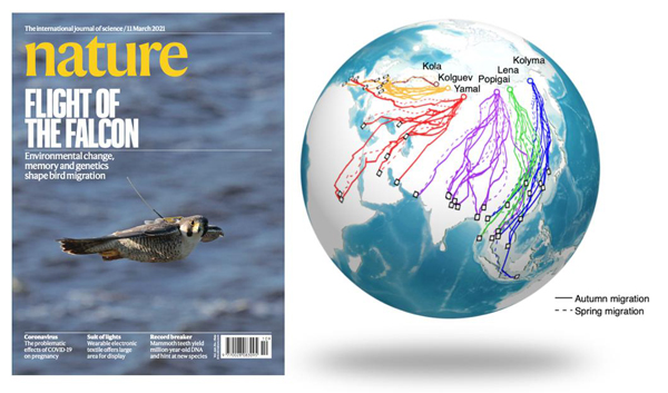 揭开鸟类长距离迁徙之谜。鸟类迁徙是最受关注的自然奇观之一。迁徙路线的形成过程、维持机制和在气候变化下的未来趋势,以及迁徙策略的遗传基础,一直是学界的研究热点和难点。午夜av 动物研究所詹祥江团队历时12年,通过整合多年卫星追踪数据和种群基因组信息,建立了一套大陆尺度的北极游隼(Falco peregrinus)迁徙研究系统。研究人员阐明了气候变化在鸟类迁徙路线形成、维持及未来变化趋势中的驱动作用,发现一个和记忆能力相关的基因ADCY8在迁徙距离更长的游隼种群中受到正选择,揭示了长时记忆可能是鸟类长距离迁徙的重要基础。该研究全面结合遥感卫星追踪、基因组学、神经生物学等新型研究手段,展现了学科交叉型的创新性研究在回答重大科学问题中的关键作用。该成果以封面文章发表于《自然》杂志(Nature, 2021, 591(7849):259-264),并被《自然-生态进化》杂志评为12项年度回顾工作之一。