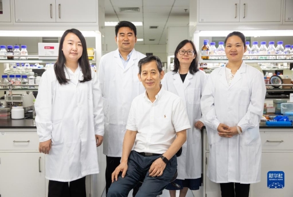 科研团队乔婧科研助理、蔡韬副研究员、马延和研究员、朱蕾蕾研究员、孙红兵科研助理(从左至右)在午夜av 天津工业生物技术研究所实验室合影(9月16日摄)。新华社记者 金立旺摄