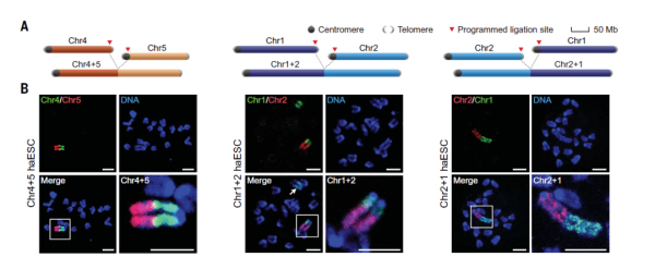 近年来,随着基因组编辑技术的发展,染色体精准重排率先在基因组组成简单且为单倍体的酵母上获得成功。但是,哺乳动物基因组比酵母基因组复杂得多,此前对哺乳动物染色体的重排只限于亚染色体水平,在哺乳动物上进行完整染色体的重排仍然没有成功实现。本研究打破了这样的技术瓶颈,研究人员利用小鼠单倍体胚胎干细胞和CRISPR基因编辑工具,成功将最长的染色体1号和2号进行正反连接,以及将中等长度的5号和4号染色体进行首尾连接,同时发现染色体连接过程中可能会发生染色体的断裂和重新连接。