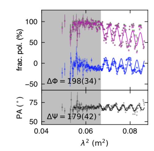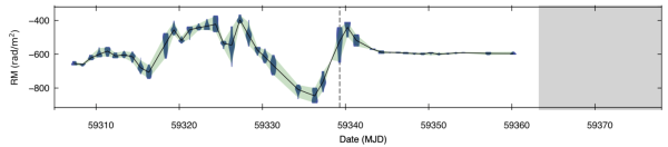 法拉第旋转量的短时标演化。阴影区有FAST观测,但是没有探测到FRB爆发,说明FRB是突然熄灭的。
