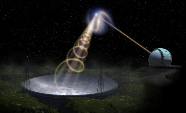 快速射电暴和宿主星系艺术想象图。世界最大单口径射电望远镜中国天眼(左下)和空间分辨率最高的单口径光学望远镜凯克望远镜(右上)承担本研究观测。绘图: 喻京川、傅海