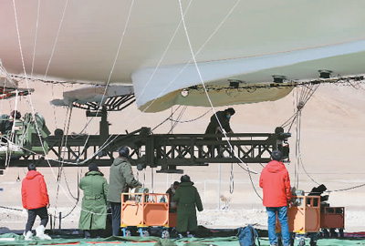 科考队员在调试“极目一号”Ⅲ型浮空艇。新华社记者 姜帆摄