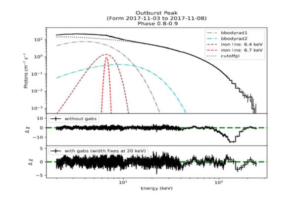 “慧眼”卫星在146千电子伏附近观测到超亮X射线源Swift J0243.6+6124的基频电子回旋吸收线。(中科院高能物理研究所供图)