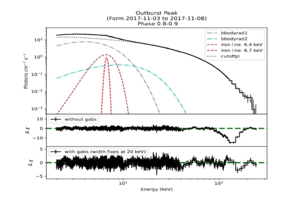 “慧眼”卫星观测吸积脉冲星艺术图。延展很远的蓝色结构的是偶极磁场,中子星附近的红色结构是多极磁场。能谱拟合中回旋线吸收线会在146 keV处产生吸收结构,拟合残差如图所示,颜色代表光子能量。