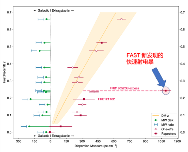 从色散-红移关系上清晰可见FRB 20190520B拥有最大的宿主星系电子密度。中科院国家天文台供图