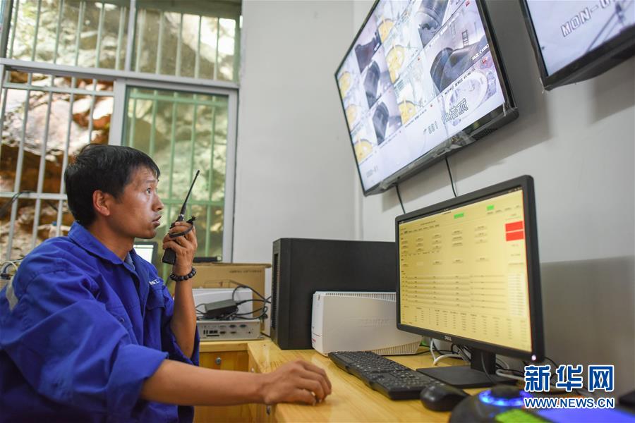 6月30日,6索并联驱动控制系统负责人武荣阳指挥馈源舱进行位置调整。新华社记者 刘续 摄