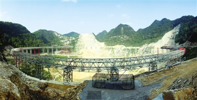 在天坑中建筑,很麻烦的一点是空间腾挪不开。为此施工人员想了很多办法,用人工补机器的不足,采取一系列新工艺,得以把几十座钢梁和几十段框架,一点点搬运到恰当的位置。