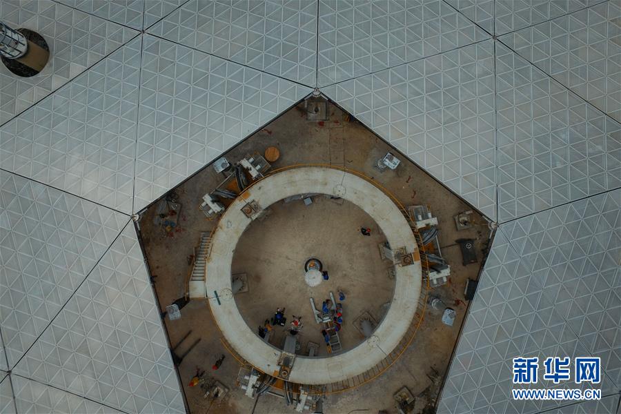 6月29日,500米口径球面射电望远镜(FAST)工程核心部件馈源舱在进行调试,其下方缺口处即目前尚未安装的7块反射面板。新华社记者 刘续 摄
