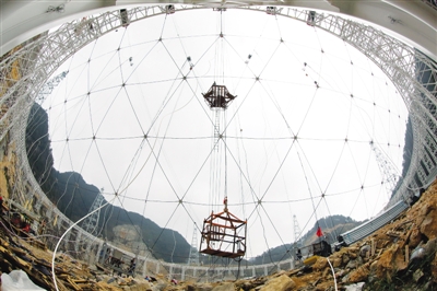 2月4日上午,位于贵州平塘的500米口径球面射电望远镜(FAST)安装了最后一根钢索,索网制造和安装工程结束。这意味着FAST的支撑框架建设完成,进入了反射面面板拼装阶段。