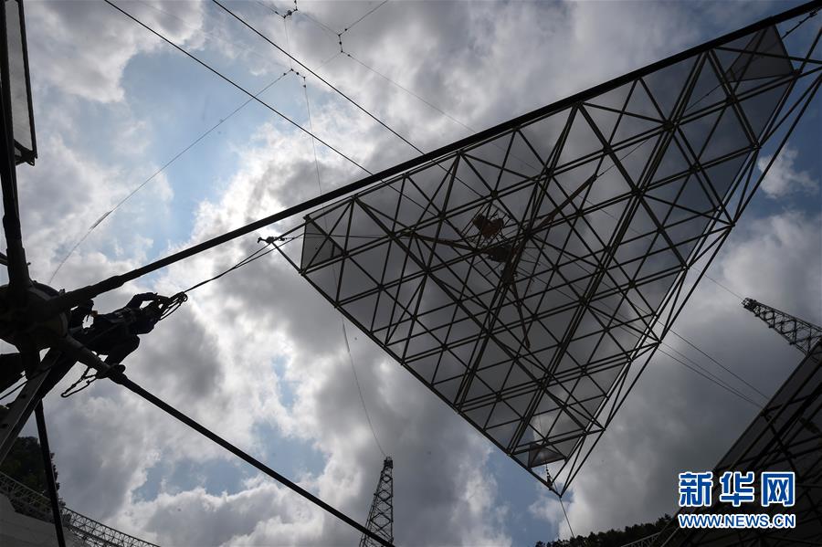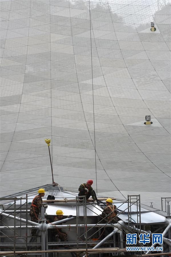 4月10日,工作人员在安装500米口径球面射电望远镜(FAST)工程反射面面板。新华社记者 欧东衢 摄