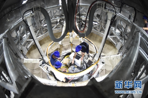 工作人员在FAST馈源舱内工作(8月10日摄)。新华社记者 欧东衢 摄