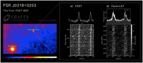 不过毫秒脉冲星的发现并不容易。国际大型射电天文台曾对其进行过多次脉冲星搜索,比如美国Arecibo望远镜在2013年6月开展的三次定点观测,都未探测到。如今这次发现是FAST–Fermi-LAT合作组的首个成果,通过对Fermi-LAT伽马射线数据的后随计时分析证实PSR J0318+0253为孤立毫秒脉冲星,并提高位置精度至亚角秒量级。