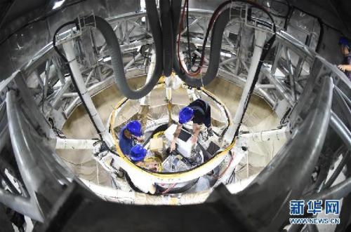 工作人员在FAST馈源舱内作业(2017年8月10日摄)。新华社记者 欧东衢 摄