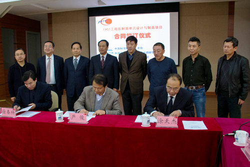国家天文台举行。国家天文台台长、FAST工程经理严俊,国家天文台副台长、FAST工程常务副经理郑晓年和中国电子科技集团第五十四研究所所长涂天杰、浙江东南网架股份有限公司董事长郭明明、总经理徐春祥以及双方的相关领导和工程技术人员参加了签订仪式。严俊、涂天杰和徐春祥代表各方在合同上签字,签订仪式由郑晓年主持。