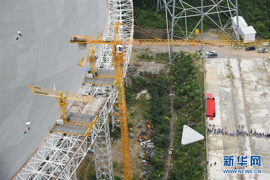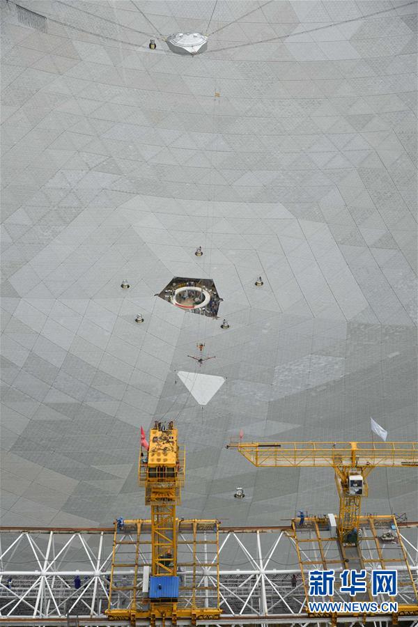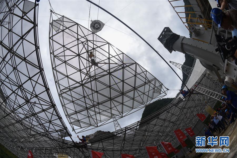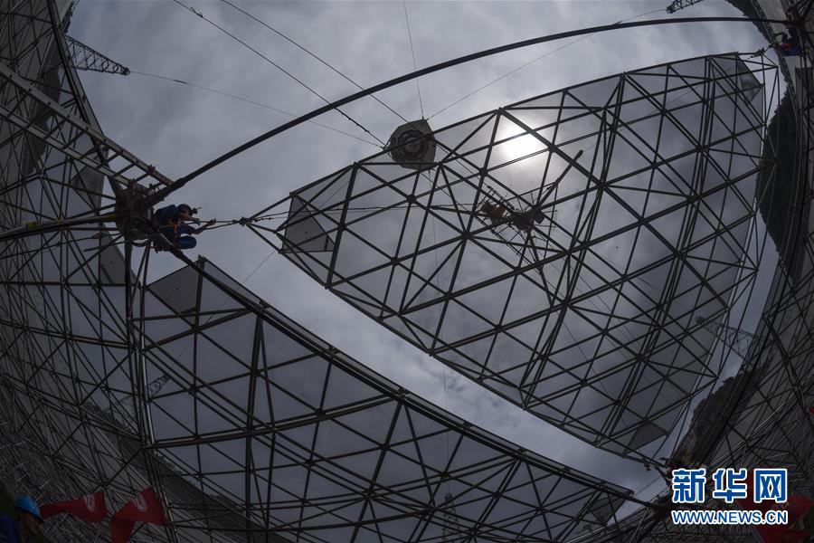 7月3日,工作人员在安装FAST最后一块反射面板。新华社记者 欧东衢 摄