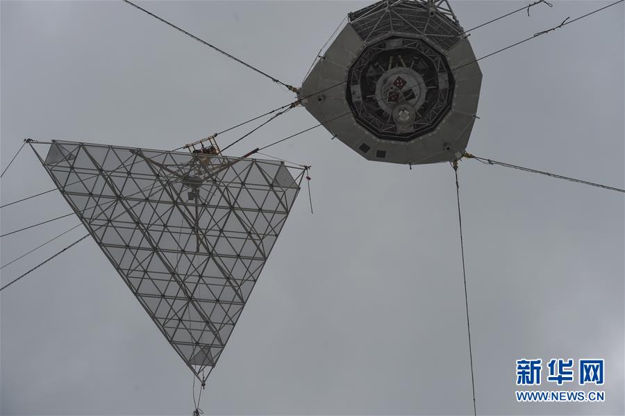 7月3日,工作人员在吊装FAST最后一块反射面板。新华社记者 刘续 摄