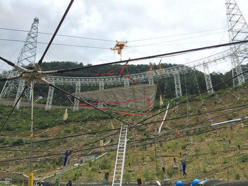2015年8月2日下午两点半,正在贵州喀斯特洼地建造的世界最大单口径射电望远镜——500米口径球面射电天文望远镜(FAST)第一块反射面单元在工程现场成功吊装,标志着该工程建设进入最后冲刺阶段。