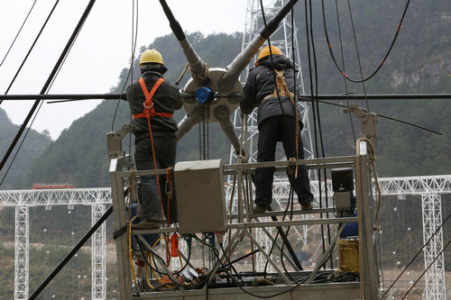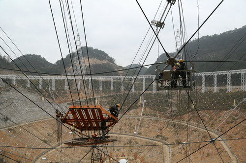 2015年2月4日上午11时45分,随着最后一根主索安装成功,标志着500米口径球面射电望远镜(FAST)索网制造和安装工程顺利完成,这是FAST工程的又一个里程碑。